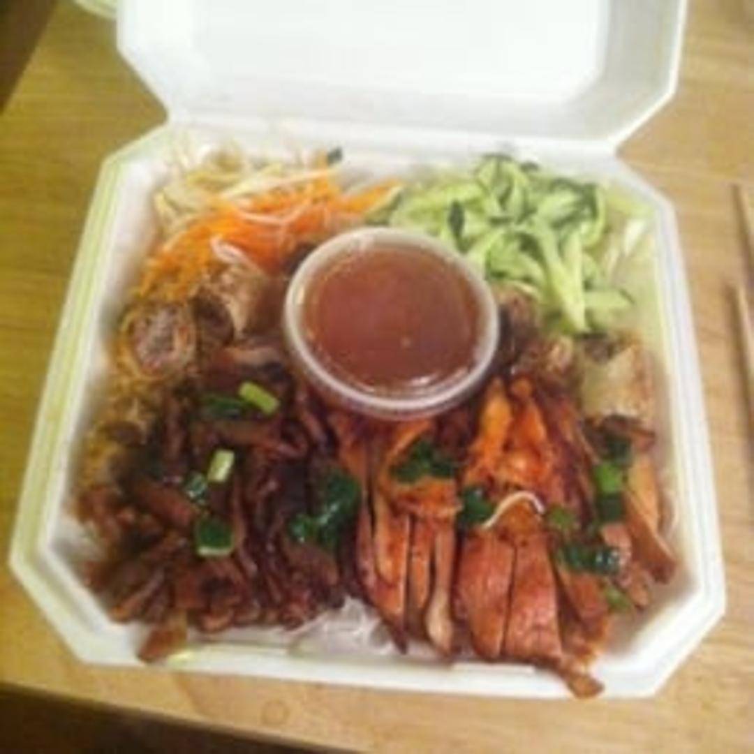 Vermicelli noodles topped with grilled pork, egg rolls, shrimp, shredded lettuce, cucumbers, bean sprouts, pickled carrots and daikon, and crushed peanuts, served with a side of nuoc cham dipping sauce.