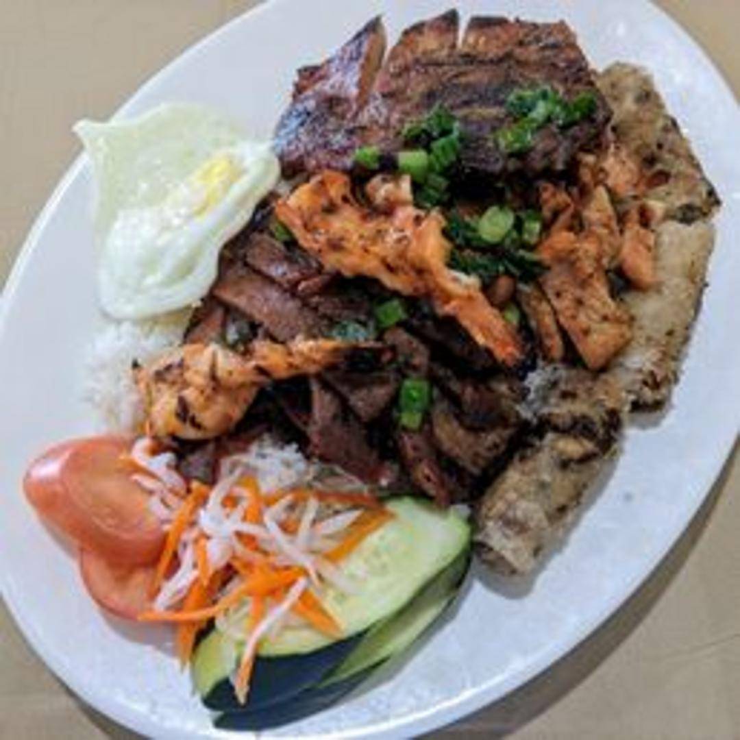 Broken rice served with grilled pork chop, shredded pork skin, a steamed egg meatloaf, and a fried egg, accompanied by pickled vegetables and nuoc cham dipping sauce.