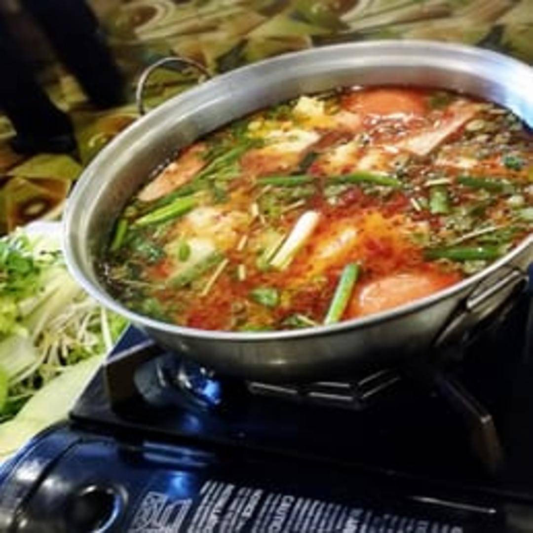 Vietnamese sour soup with pineapple, tomatoes, bean sprouts, and your choice of protein in a tangy tamarind broth, garnished with herbs.