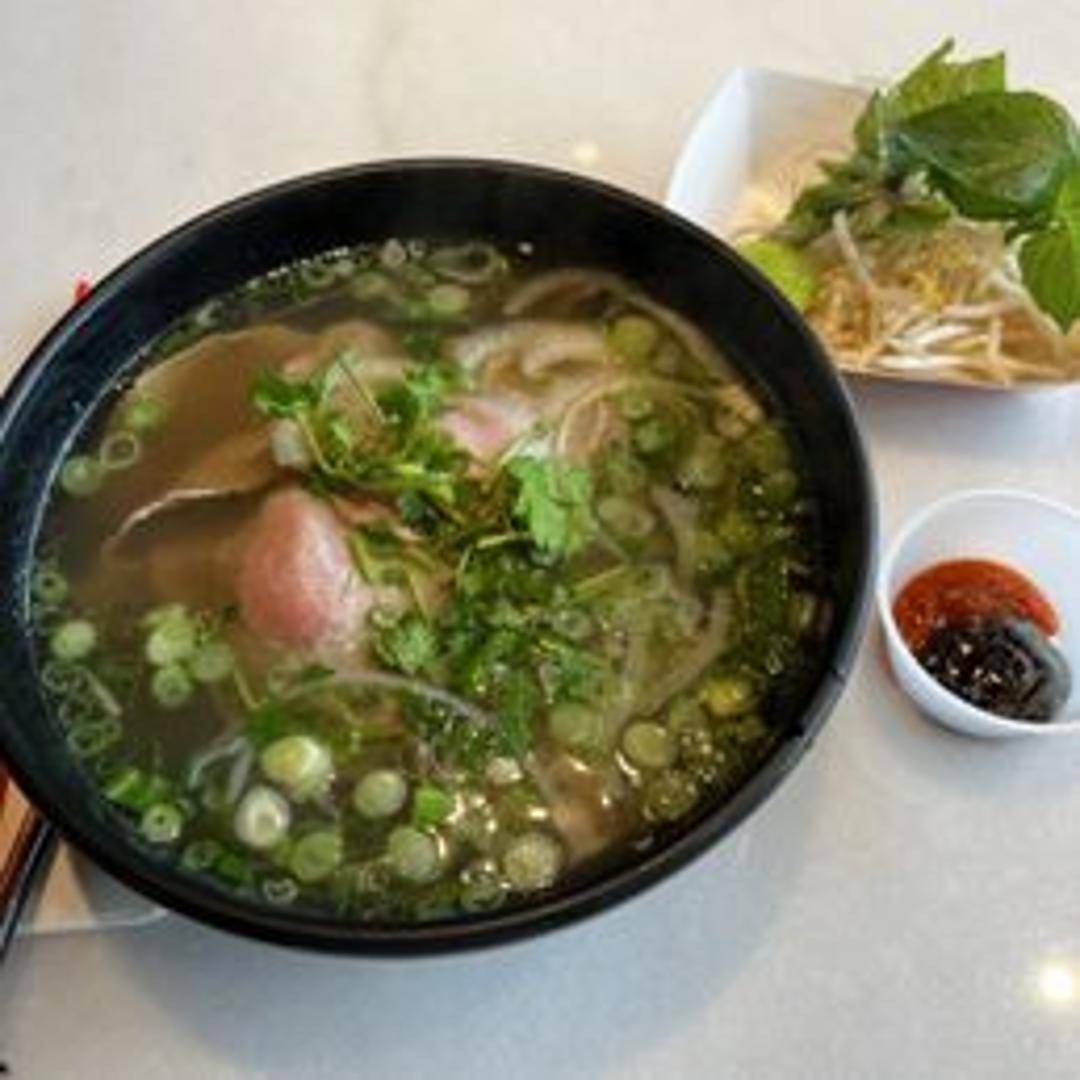 A classic Vietnamese noodle soup featuring a rich and flavorful beef broth, rice noodles, and thinly sliced beef. Garnished with fresh herbs like cilantro, scallions, and onions. Served with a side of bean sprouts, lime wedges, jalapenos, and hoisin and sriracha sauces for customization.