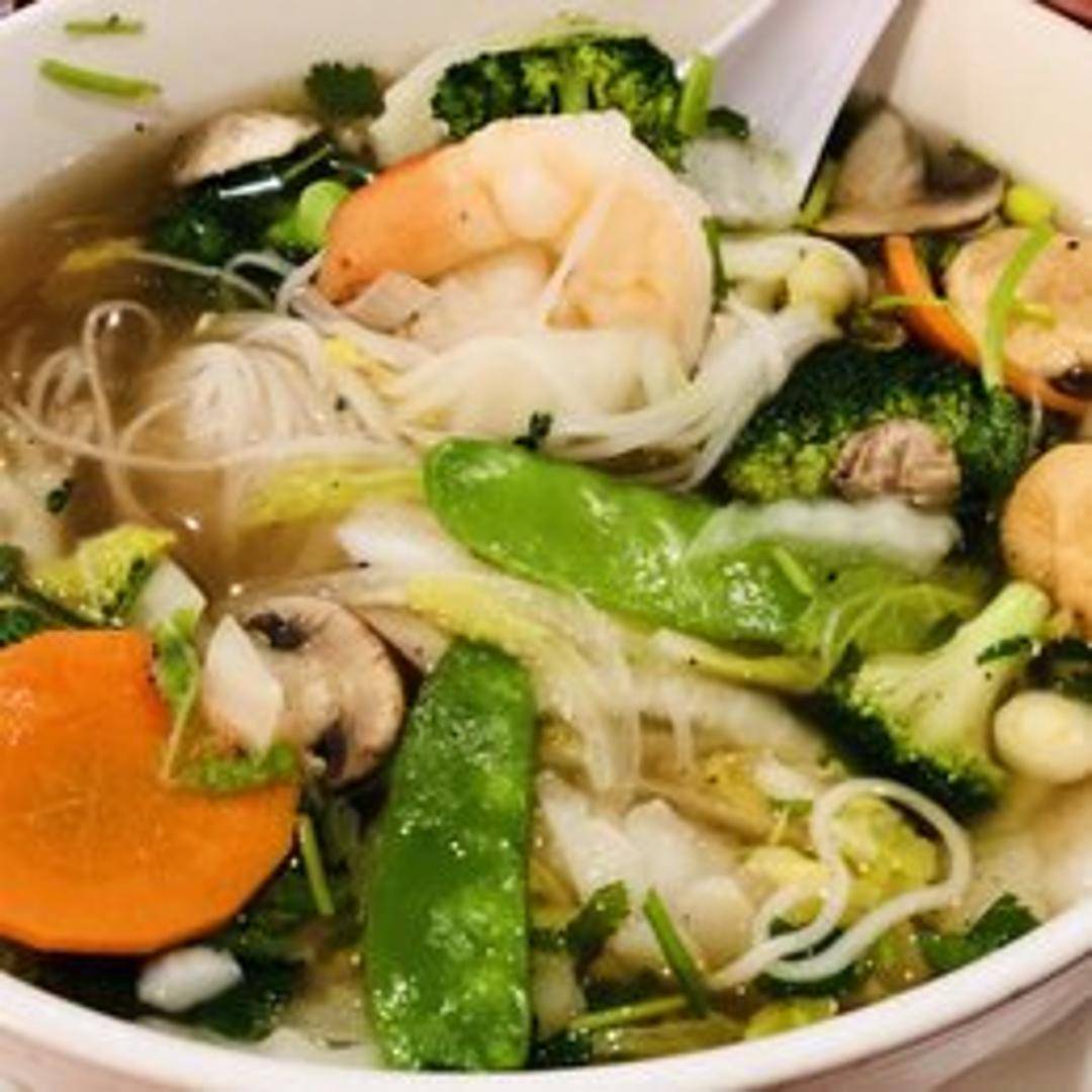 An exquisite variation of Vietnam's national dish, featuring a light and savory broth brimming with a fresh assortment of seafood, including succulent shrimp, tender squid, and flavorful fish balls. This pho is served with slippery rice noodles and garnished with crisp green onions and aromatic herbs, offering a delightful oceanic twist on a classic comfort food.