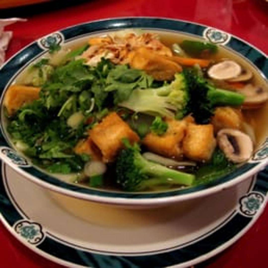 A comforting and aromatic vegetarian version of the traditional Vietnamese noodle soup, crafted with a flavorful, clear vegetable broth, tender rice noodles, and a rich assortment of fresh vegetables, mushrooms, and often tofu, served with a side of crisp herbs and bean sprouts.