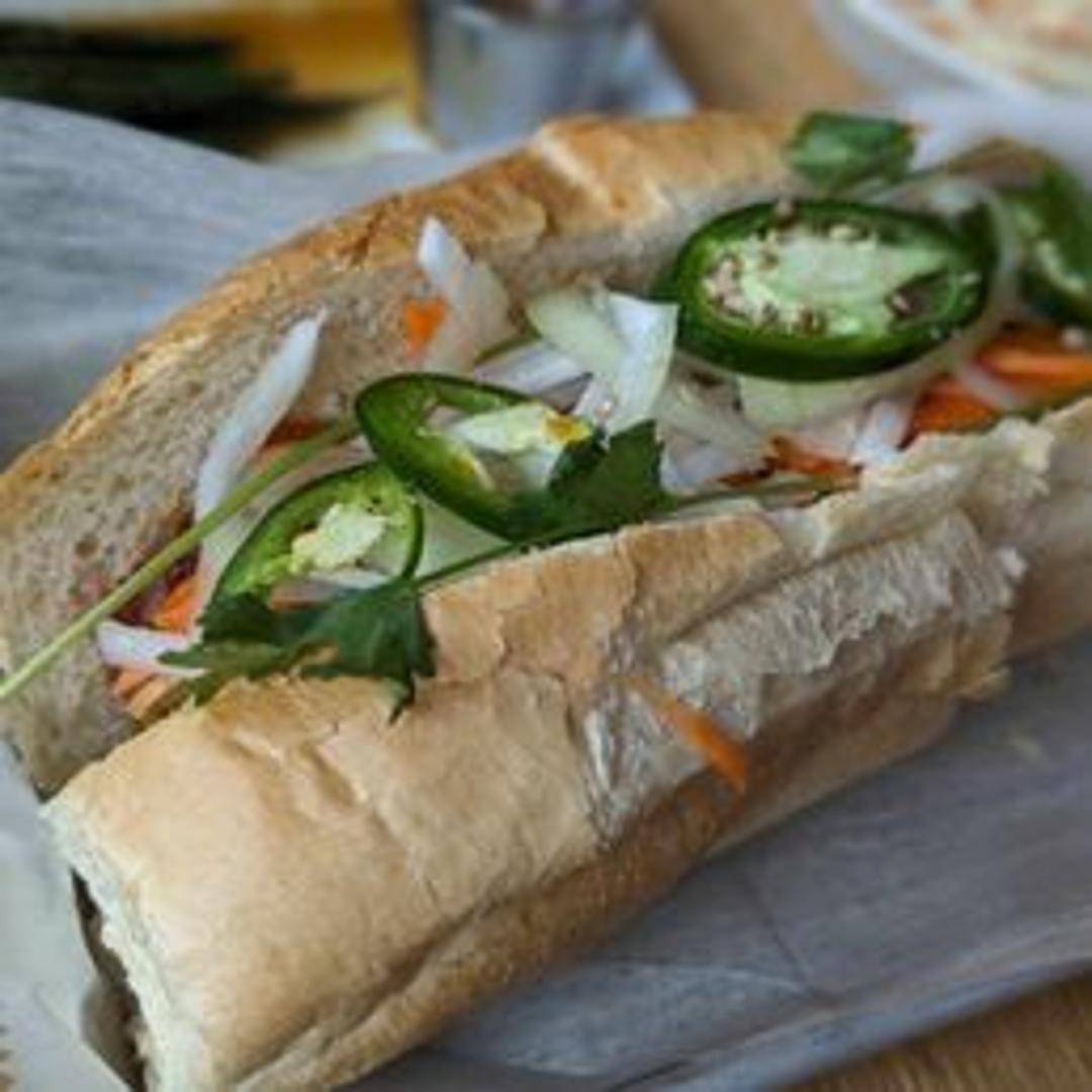 A Vietnamese sandwich featuring a crusty baguette filled with grilled or roasted chicken, pickled carrots and daikon, cucumber, cilantro, and a spread of mayonnaise or pâté. May include jalapeños for added spice.