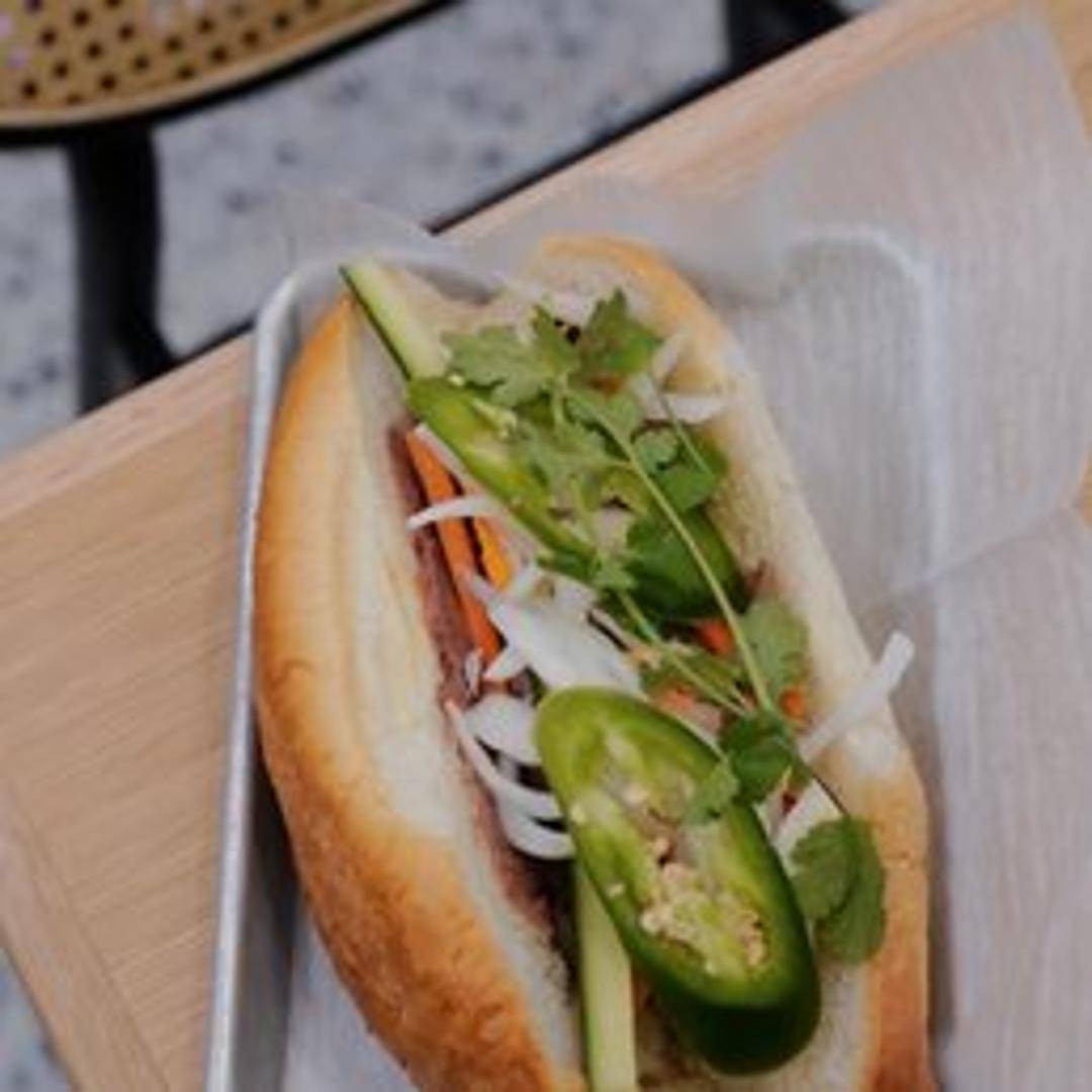 A classic Vietnamese sandwich featuring a crispy baguette filled with grilled or roasted pork, pickled vegetables (carrots and daikon), cilantro, jalapenos, and a spread of pate and mayonnaise.