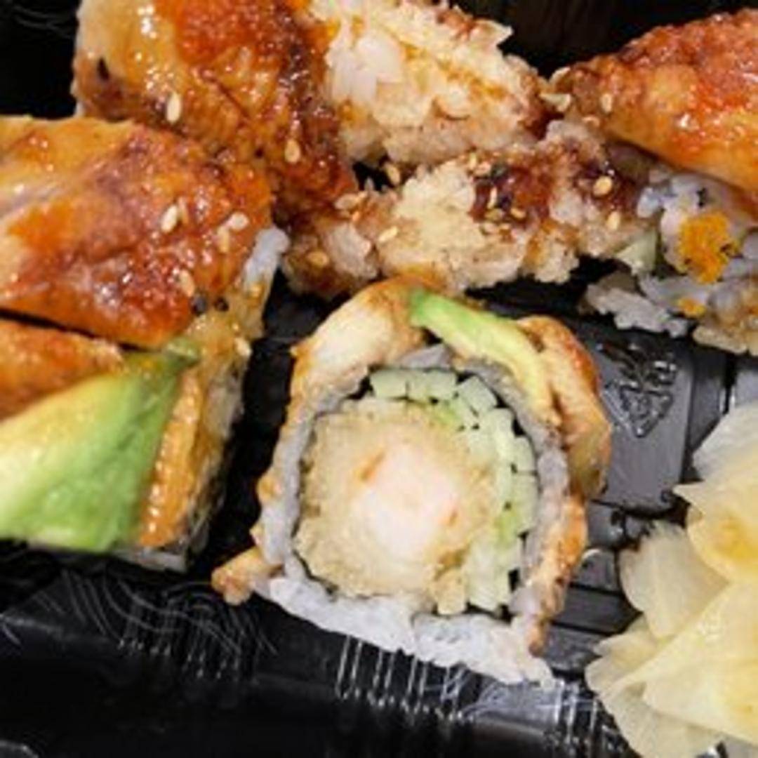 A visually striking sushi roll, typically featuring shrimp tempura and cucumber inside, topped with avocado and a drizzle of eel sauce. Often includes black tobiko (flying fish roe) for added texture and visual appeal.