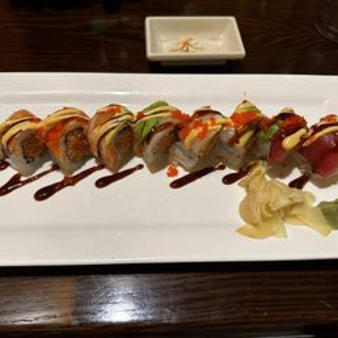 A visually appealing sushi roll. Because the specific ingredients are not given, the description is broad: Often features a combination of seafood like tuna and avocado, layered with spicy mayo and other sauces, creating a vibrant and flavorful experience.