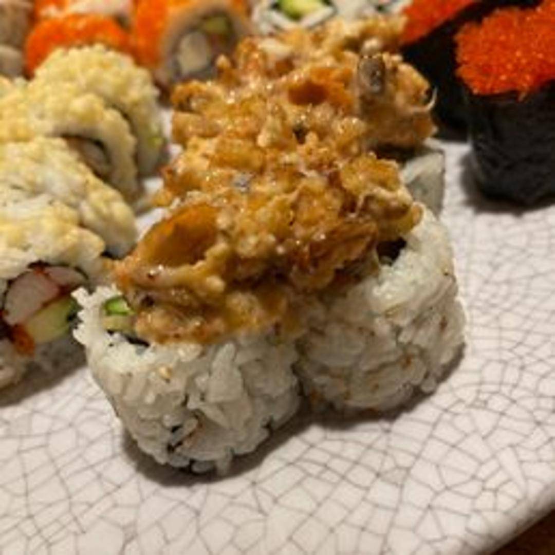 A flavorful inside-out roll featuring crispy soft-shell crab, cucumber, avocado, lettuce, and tobiko. Rolled with seasoned sushi rice and nori seaweed, and often served with a sweet and savory eel sauce.