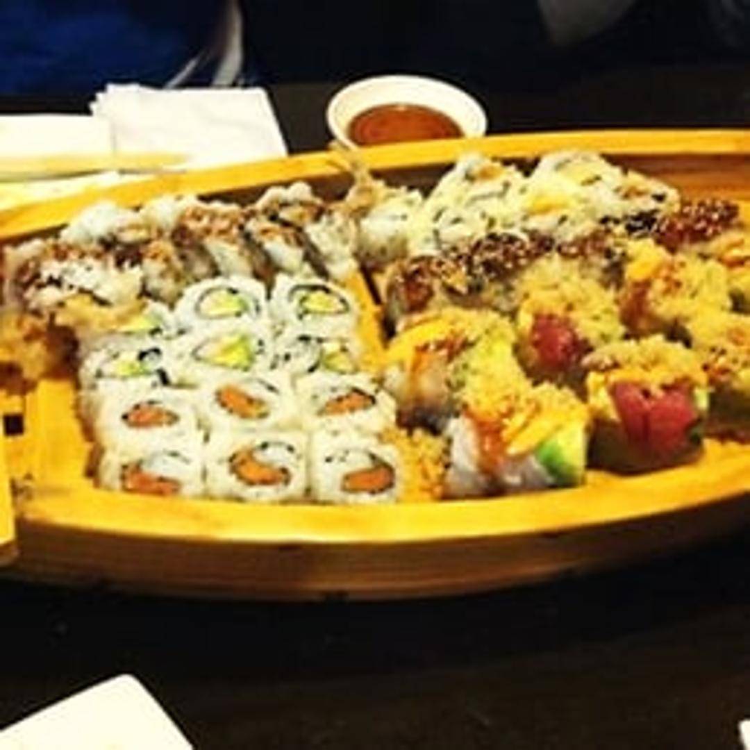 An assortment of fresh sushi and sashimi artfully arranged on a decorative wooden boat. Includes a variety of nigiri (chef's choice of fish on rice), maki rolls, and thinly sliced raw fish. Served with soy sauce, wasabi, and pickled ginger.