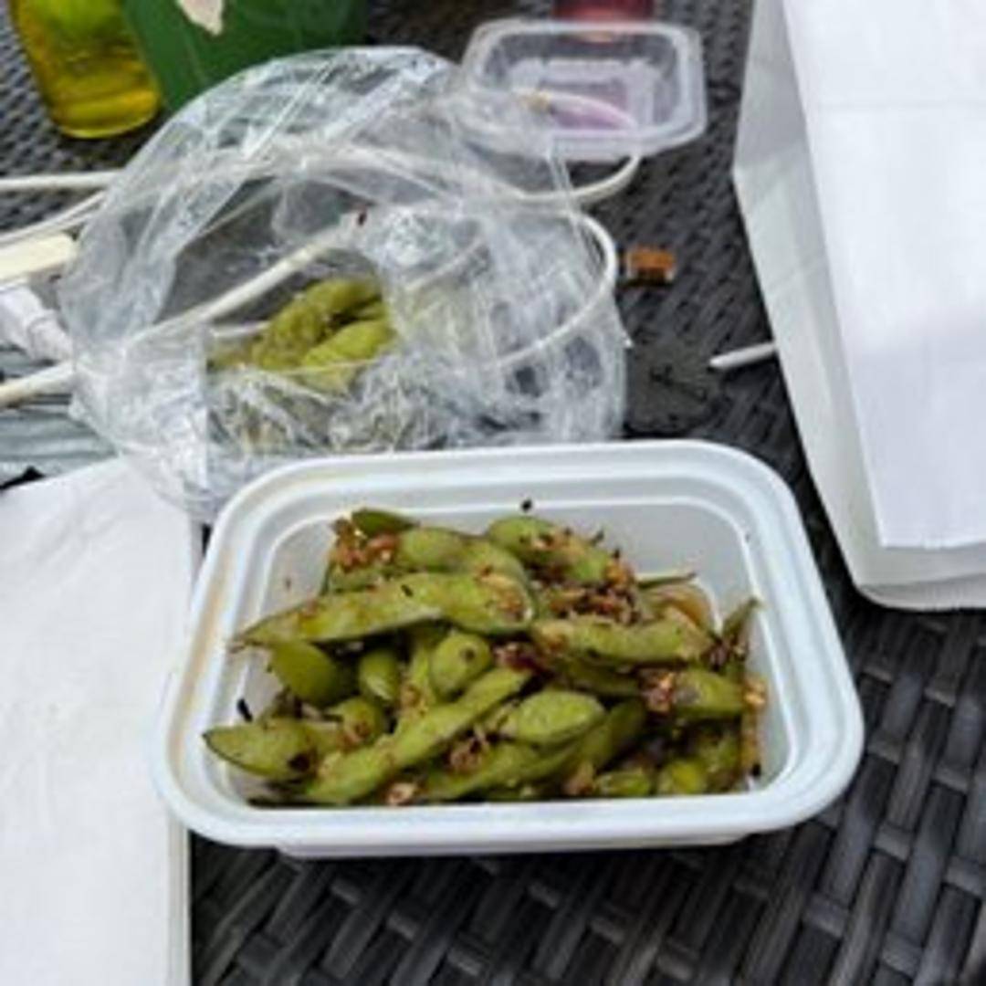 Steamed edamame pods tossed with a spicy seasoning blend.