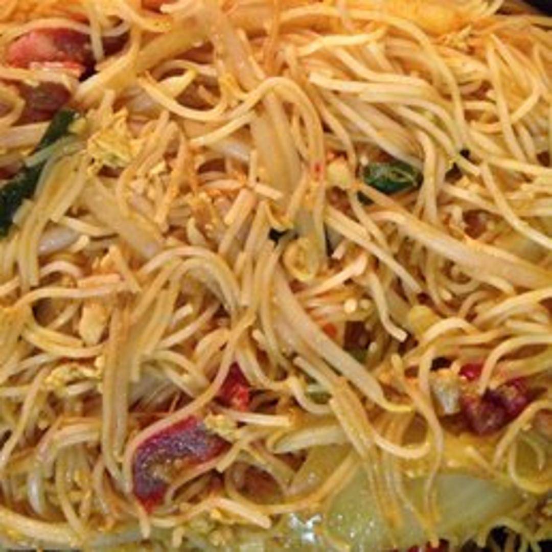 Thin rice noodles stir-fried with shrimp, chicken, pork, vegetables, and curry powder. A flavorful and slightly spicy dish.