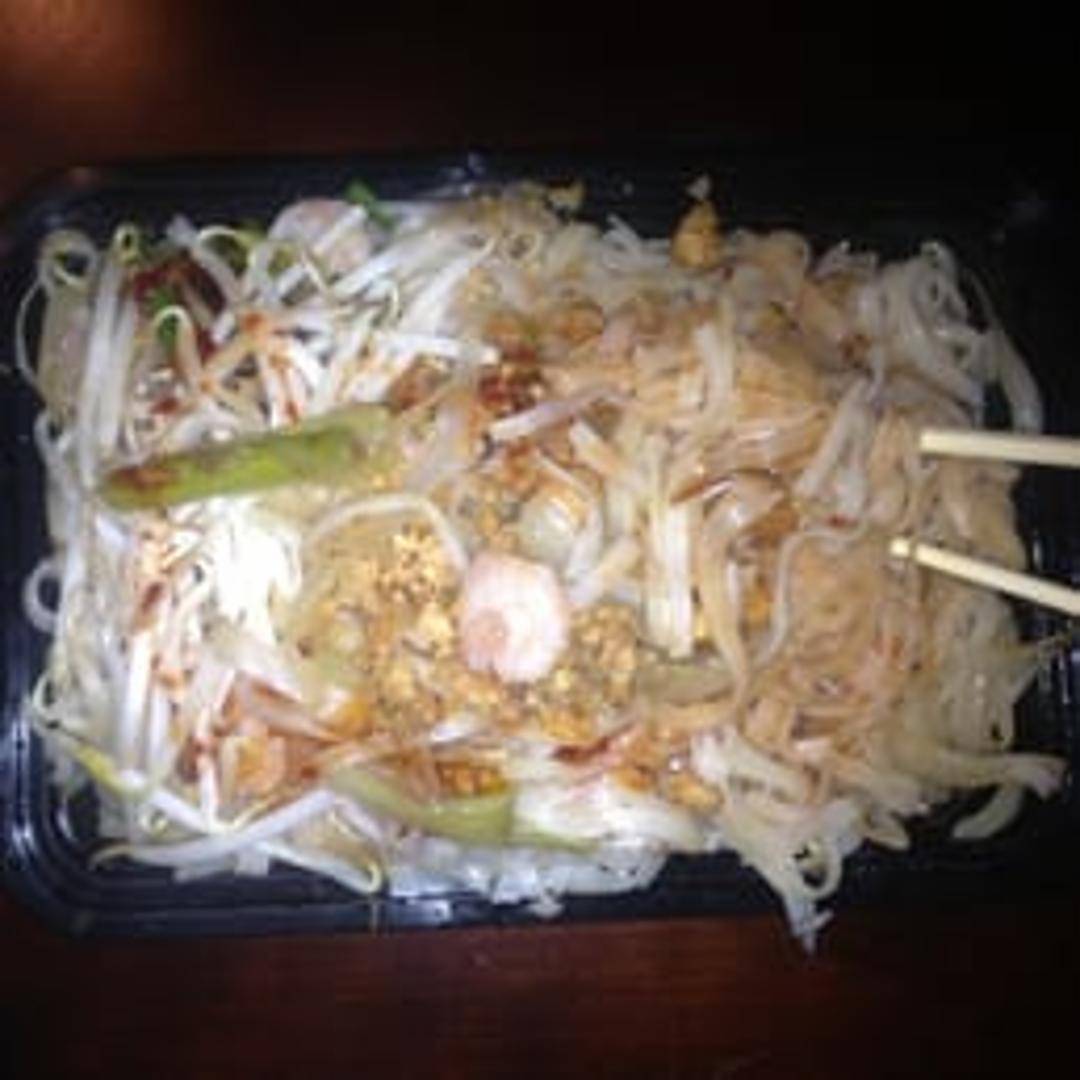 Stir-fried rice noodles with egg, bean sprouts, tofu, and shrimp (or your choice of protein), tossed in a sweet, sour, and savory tamarind-based sauce. Garnished with crushed peanuts and lime wedges.