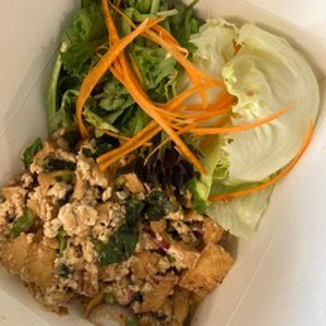 Crumbled tofu marinated in lime juice, chili flakes, herbs, and roasted rice powder. Served with lettuce wraps and fresh vegetables.