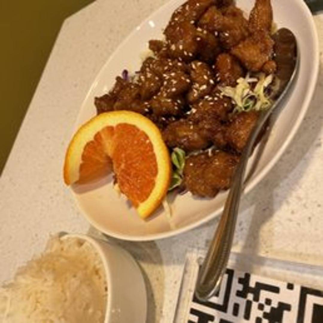 Crispy, plant-based chicken coated in a sweet and tangy orange sauce. Served with a side of rice.