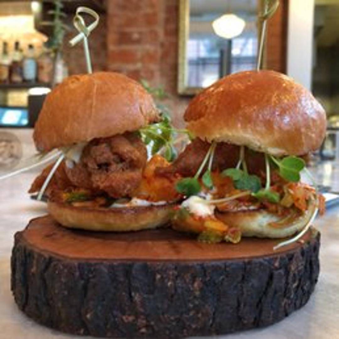 Indulge in our exquisite Fried Oyster Sandwich, featuring plump, perfectly golden-fried oysters, delicately crispy on the outside and tender within. These succulent oysters are nestled in a soft, toasted roll, complemented by a vibrant, house-made remoulade and crisp, refreshing accompaniments.