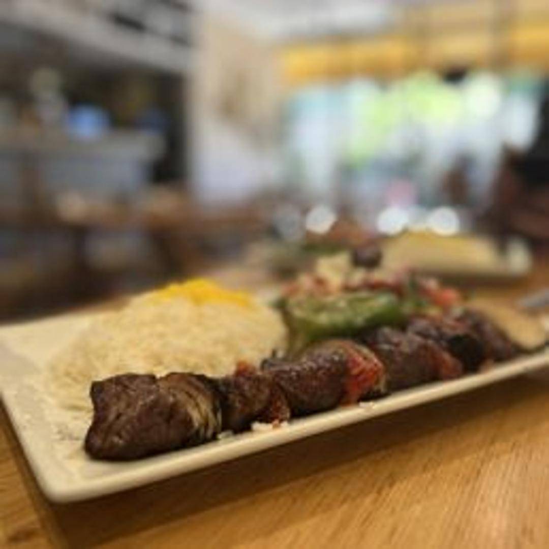 Tender and marinated pieces of meat (typically lamb or beef) grilled to perfection on a skewer. Served on a plate with sides such as rice pilaf, grilled vegetables, and hummus. A classic Mediterranean favorite.