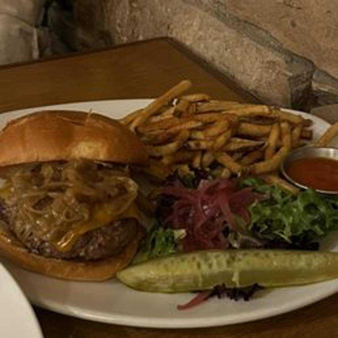 A classic tavern-style burger featuring a juicy beef patty, melted cheese, crisp lettuce, ripe tomato, and our signature sauce, served on a toasted bun.