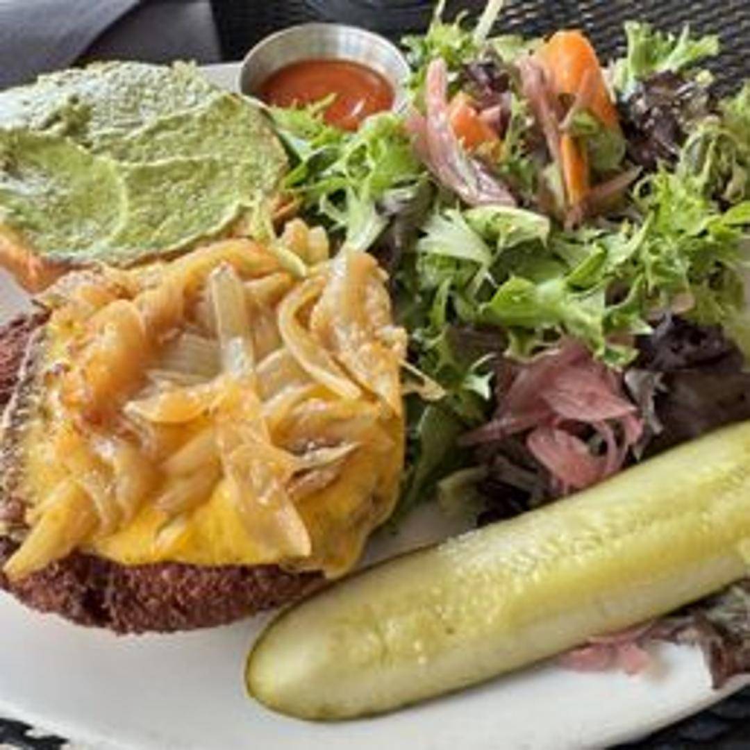 A flavorful and hearty quinoa burger patty, topped with avocado, sprouts, red onion, and a chipotle aioli, served on a whole wheat bun.