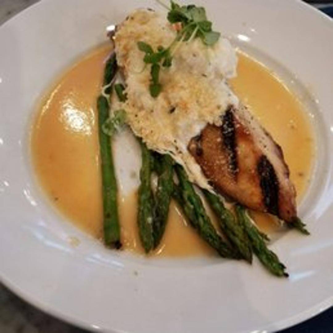 Pan-seared or grilled Cobia, a firm, white fish, served with seasonal vegetables and a complementary sauce. Preparation and accompaniments may vary.
