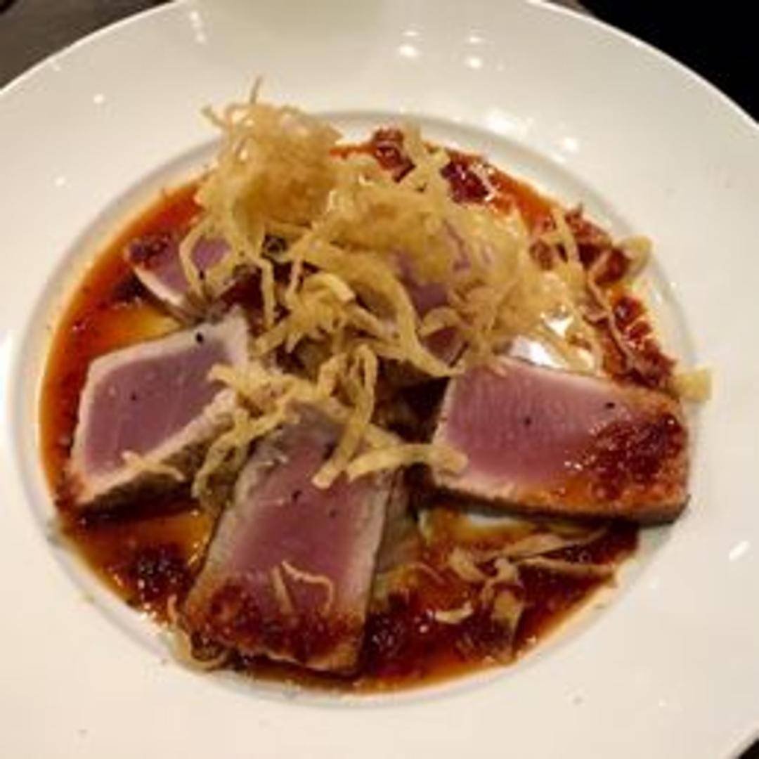 Delicately seared, sushi-grade tuna served with complementary accompaniments. Expect a balance of flavors and textures that may include elements like avocado, seaweed salad, ginger, soy sauce, and wasabi, showcasing the tuna's freshness and quality.