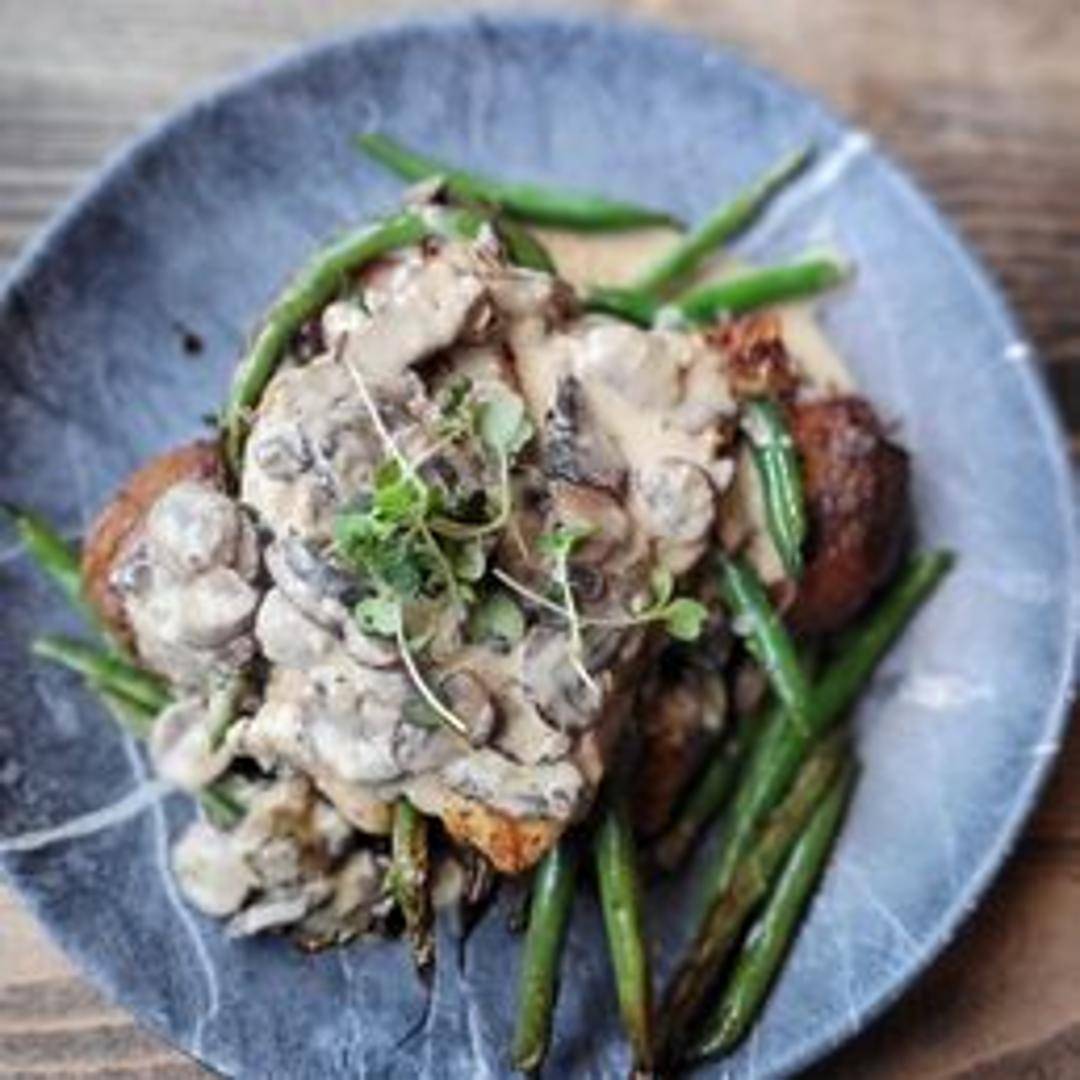 Tender chicken breast sautéed with a medley of savory mushrooms and fresh tarragon in a delicate creamy sauce. Served with your choice of side.