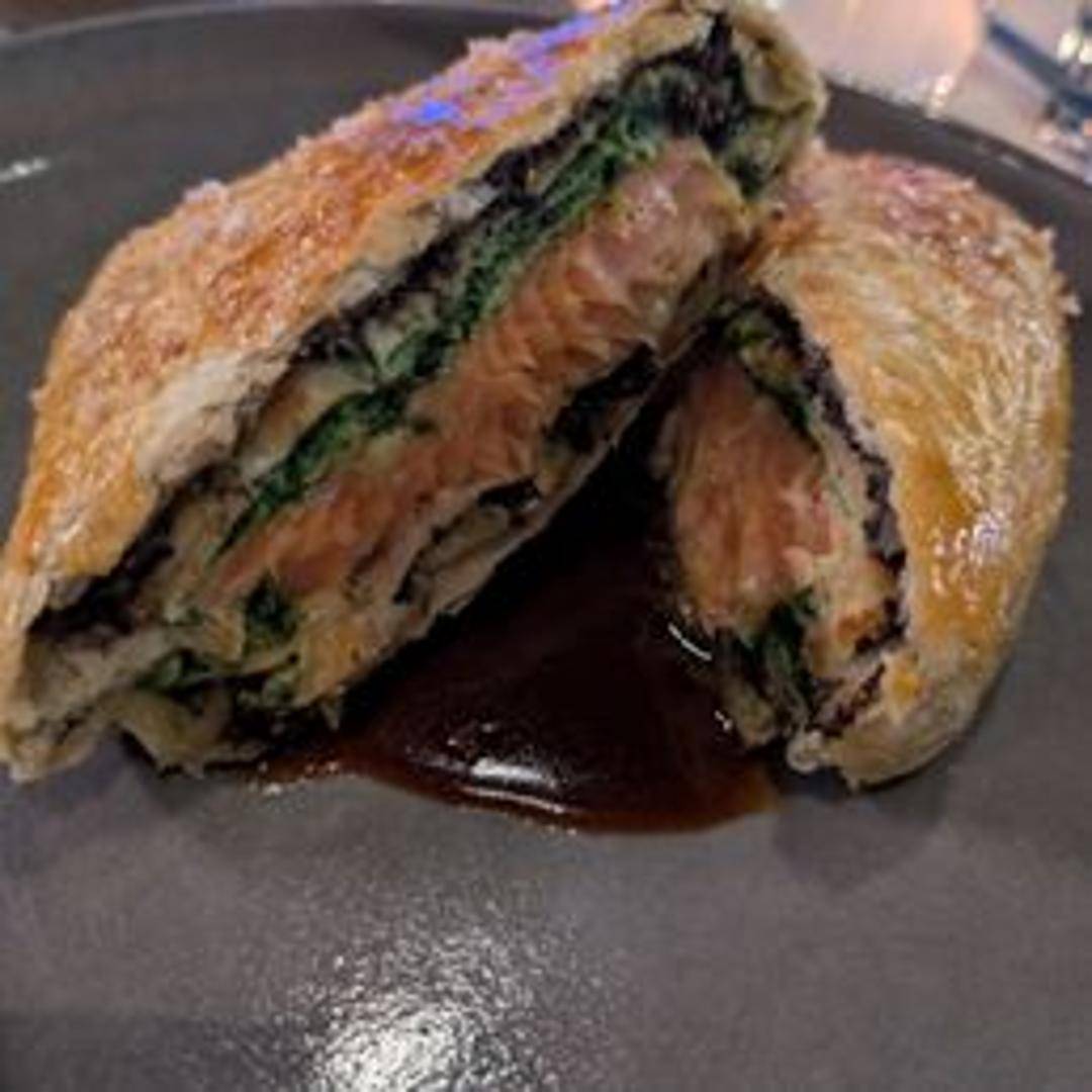 A flaky puff pastry encasing a tender fillet of salmon, layered with duxelles and herbs, baked to perfection.