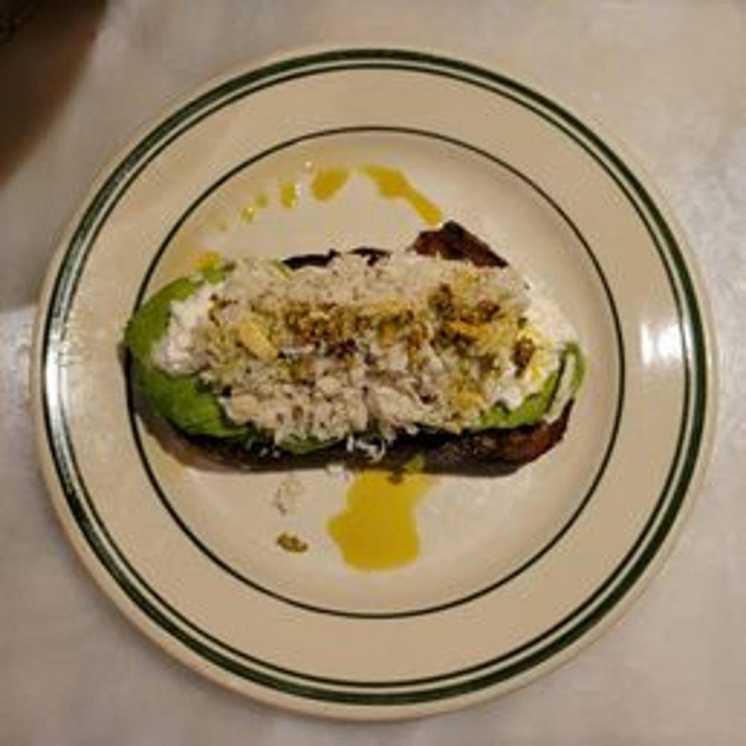 Toasted bread topped with sweet, delicate snow crab meat, often with a creamy or flavorful spread.