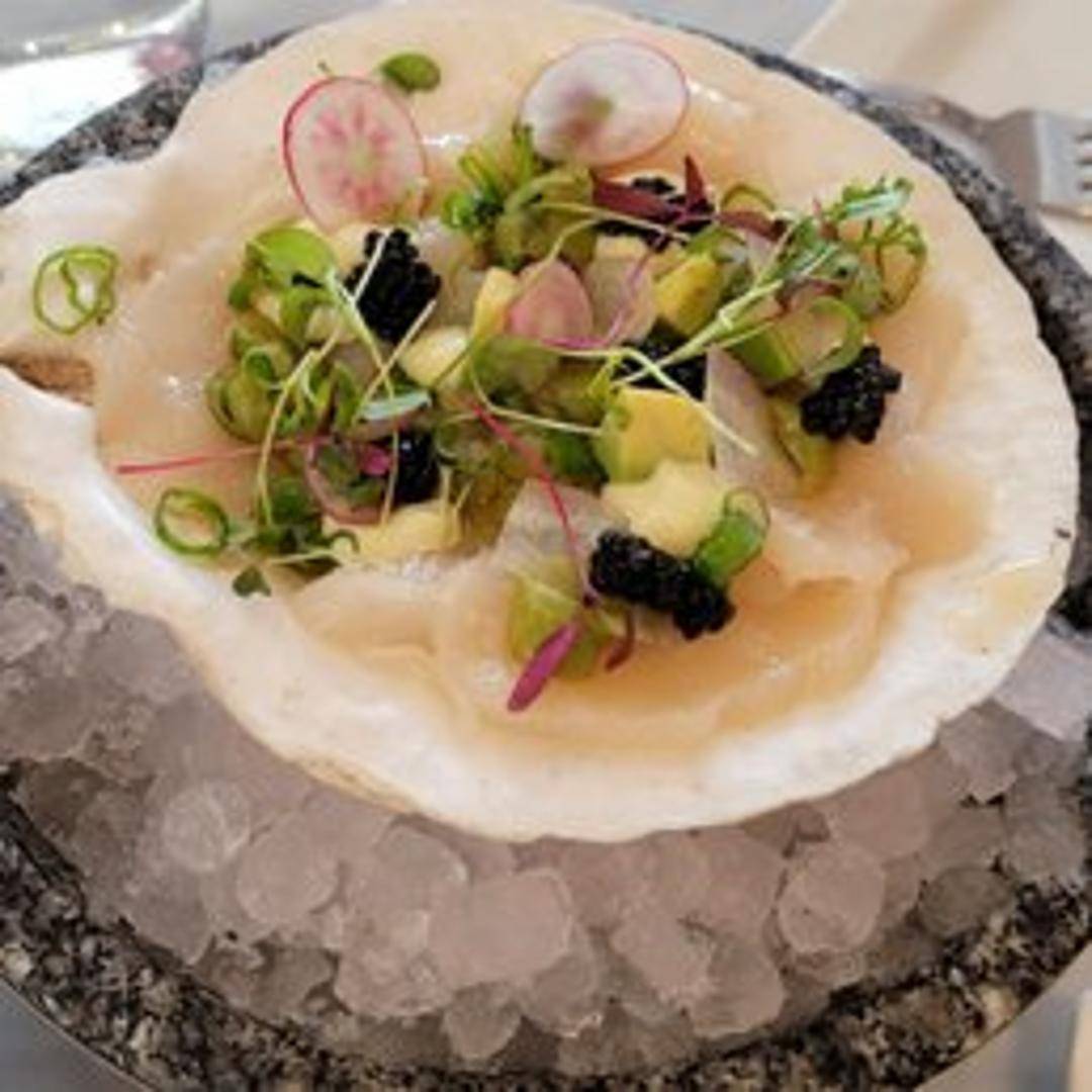 Fresh, pristine Day Boat Scallops, served raw. These scallops are known for their exceptional sweetness and delicate texture, often enhanced with a touch of citrus or a flavorful vinaigrette.