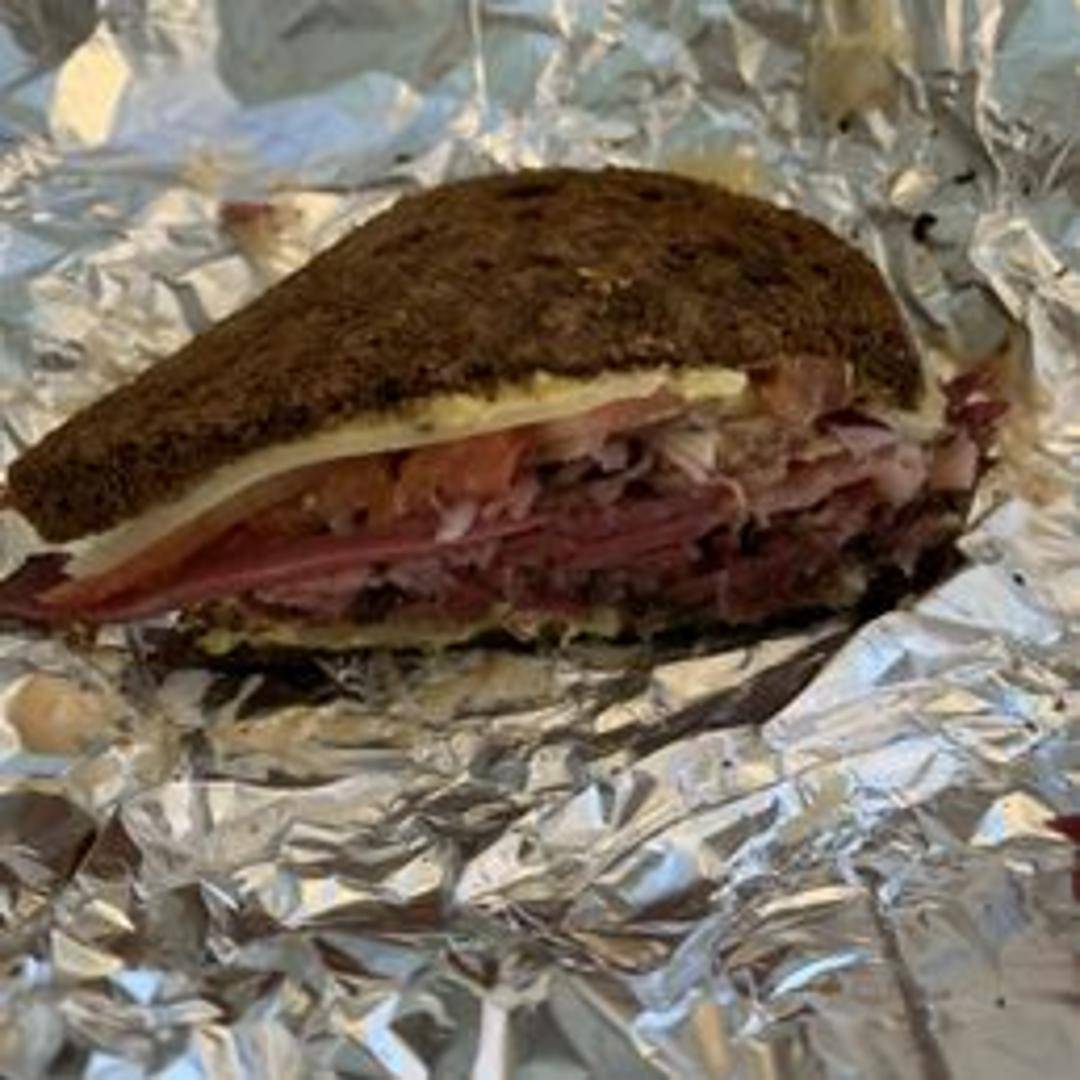 Sam's famous pastrami, coleslaw, Russian dressing, and Swiss cheese stacked on toasted Jewish rye bread.
