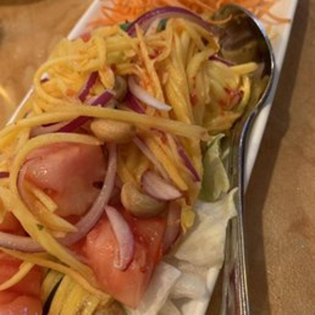 Experience the refreshing and bold flavors of Thailand with Sam Phao Thai Cuisine's Papaya Salad, known as Som Tum. This iconic dish features crisp, shredded green papaya expertly pounded in a mortar with fresh chilies, garlic, juicy tomatoes, long beans, peanuts, lime juice, fish sauce, and a touch of palm sugar. The result is a vibrant salad that delivers a harmonious explosion of spicy, sour, sweet, and salty tastes, along with a delightful crunch.