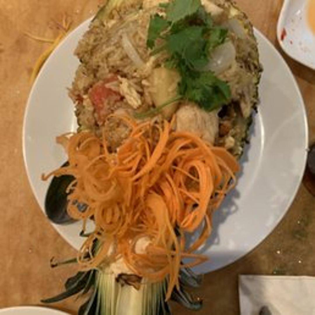 Savor the tropical flavors of our Pineapple Fried Rice, a vibrant and visually stunning dish. Golden jasmine rice is stir-fried with succulent chunks of fresh pineapple, roasted cashews, plump raisins, bell peppers, onions, and a hint of yellow curry powder, often served charmingly in a hollowed-out pineapple half.