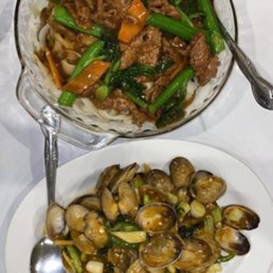Wide rice noodles (ho fun) stir-fried with tender beef, bean sprouts, and scallions in a savory soy sauce-based sauce.