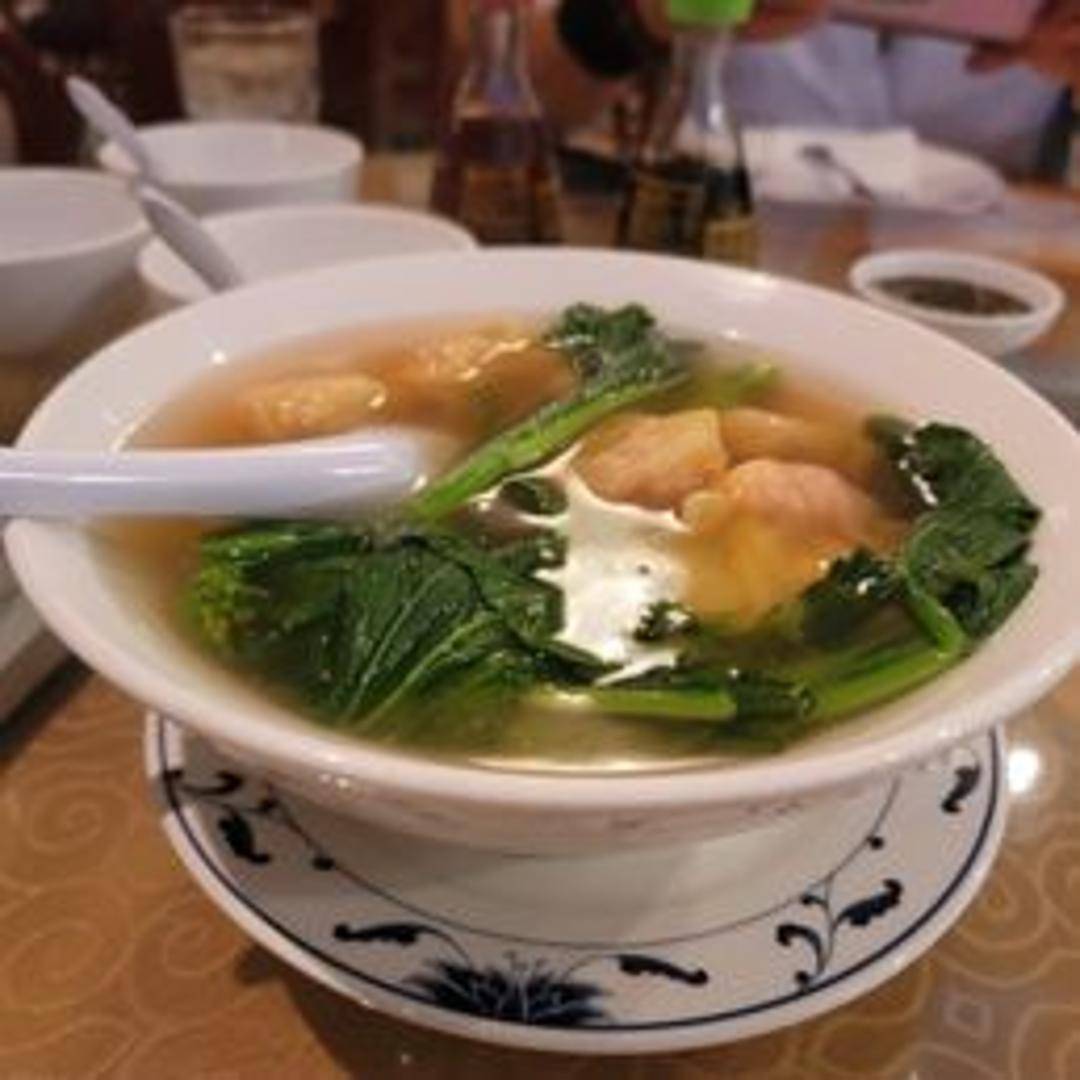 A comforting and classic soup featuring delicate wontons filled with seasoned meat or seafood, floating in a clear, savory broth, often garnished with fresh greens and scallions for added flavor.