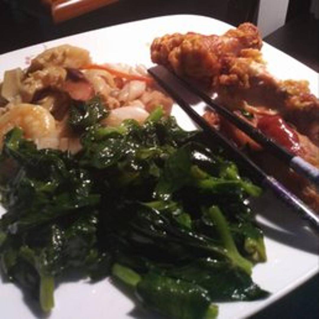 Tender and vibrant snow pea leaves stir-fried to perfection, complemented by the unique, savory, and umami-rich flavor of diced preserved egg, creating a traditional and delicate vegetable dish.