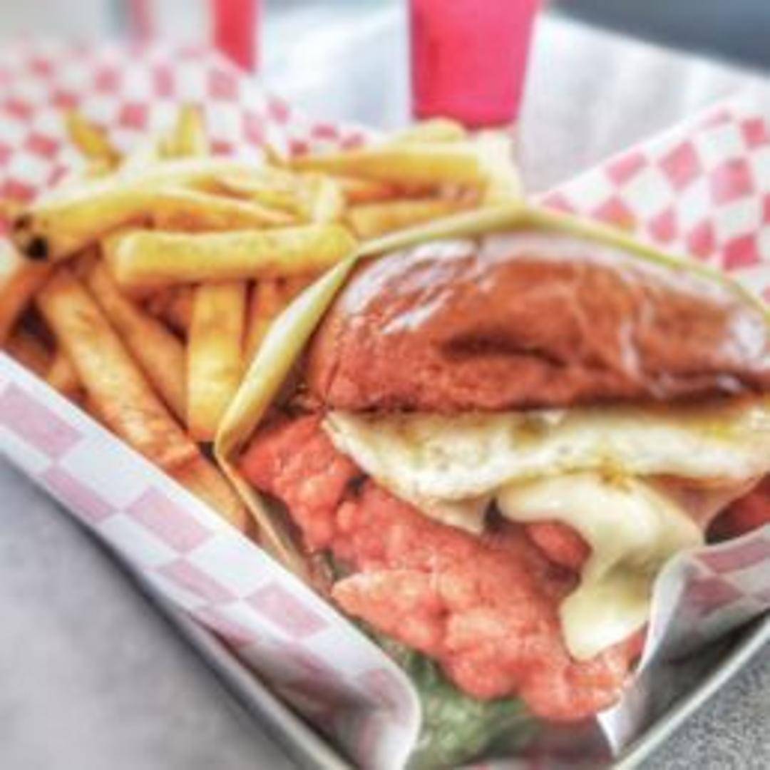 Crispy fried chicken breast coated in a spicy seasoning blend, served on a toasted bun with lettuce, tomato, pickles, and a creamy spicy sauce.