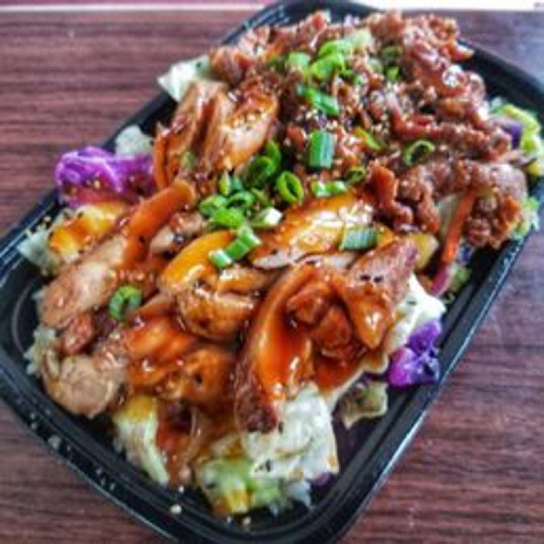 Savory slices of marinated beef served over a bed of steamed rice. Topped with sesame seeds and green onions.