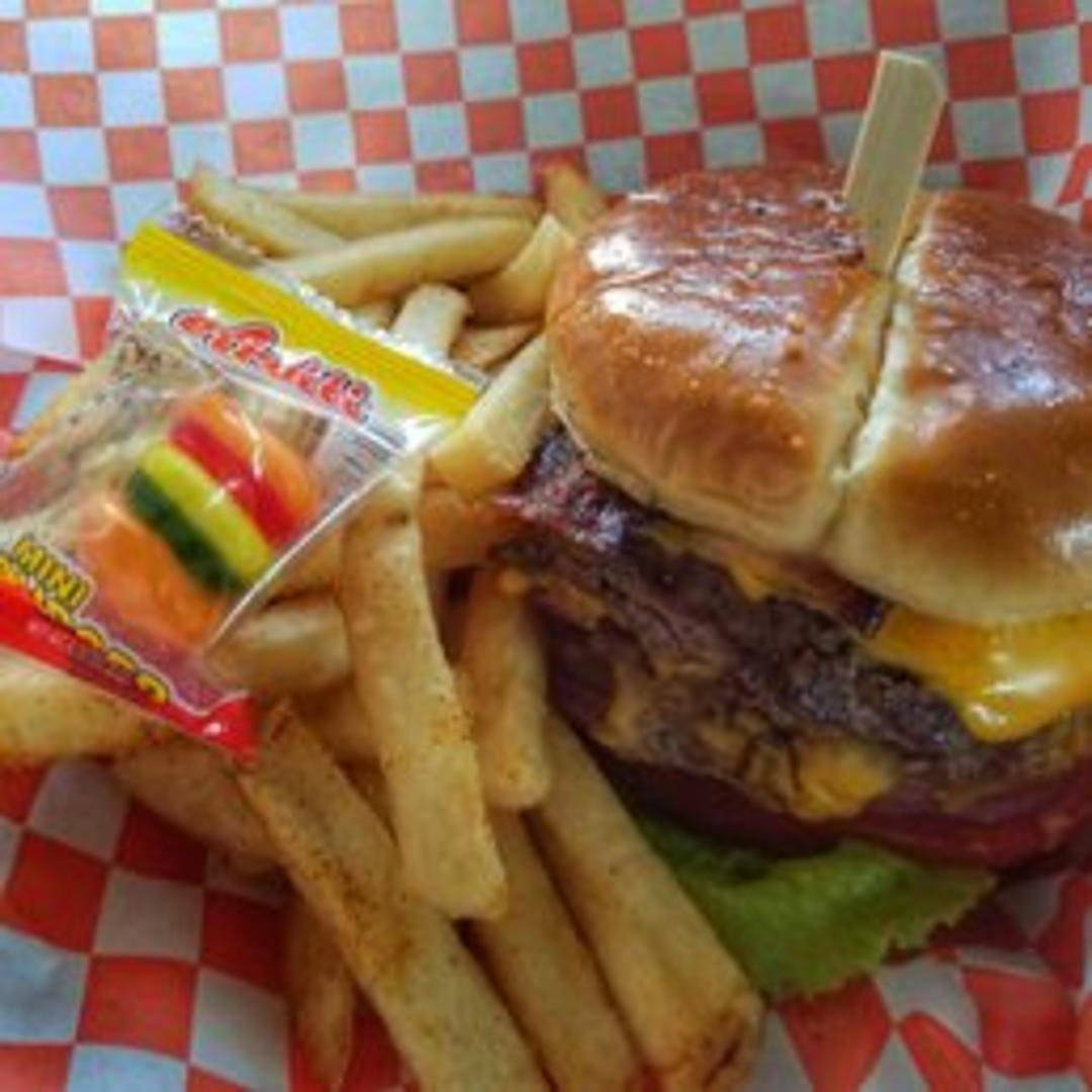 A charbroiled beef patty topped with crispy bacon, melted cheddar cheese, lettuce, tomato, onion, and your choice of condiments on a toasted bun.
