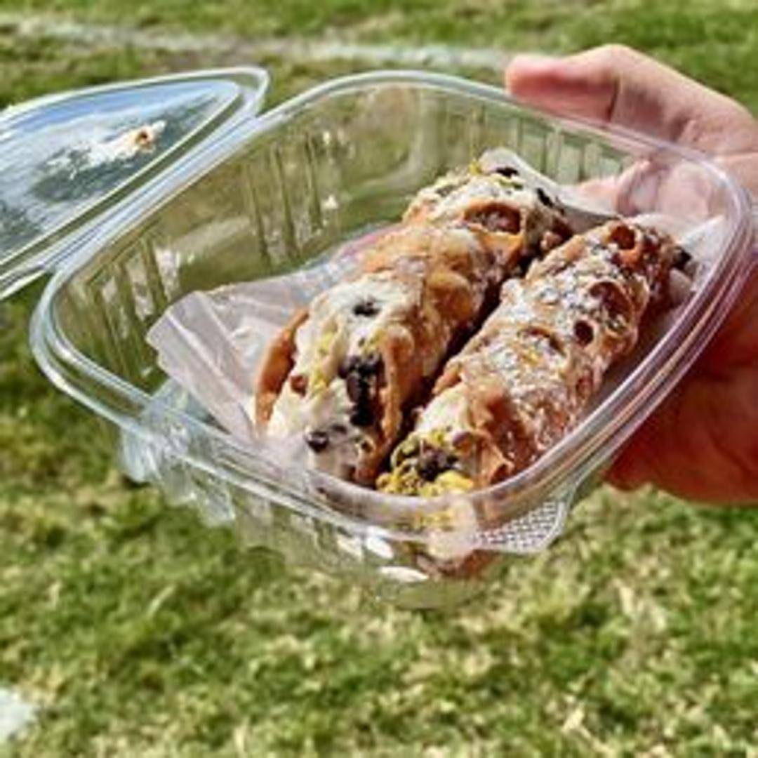A crispy, tube-shaped shell filled with a sweet, creamy ricotta cheese filling, often mixed with chocolate chips, candied fruit, or pistachios. Lightly dusted with powdered sugar.