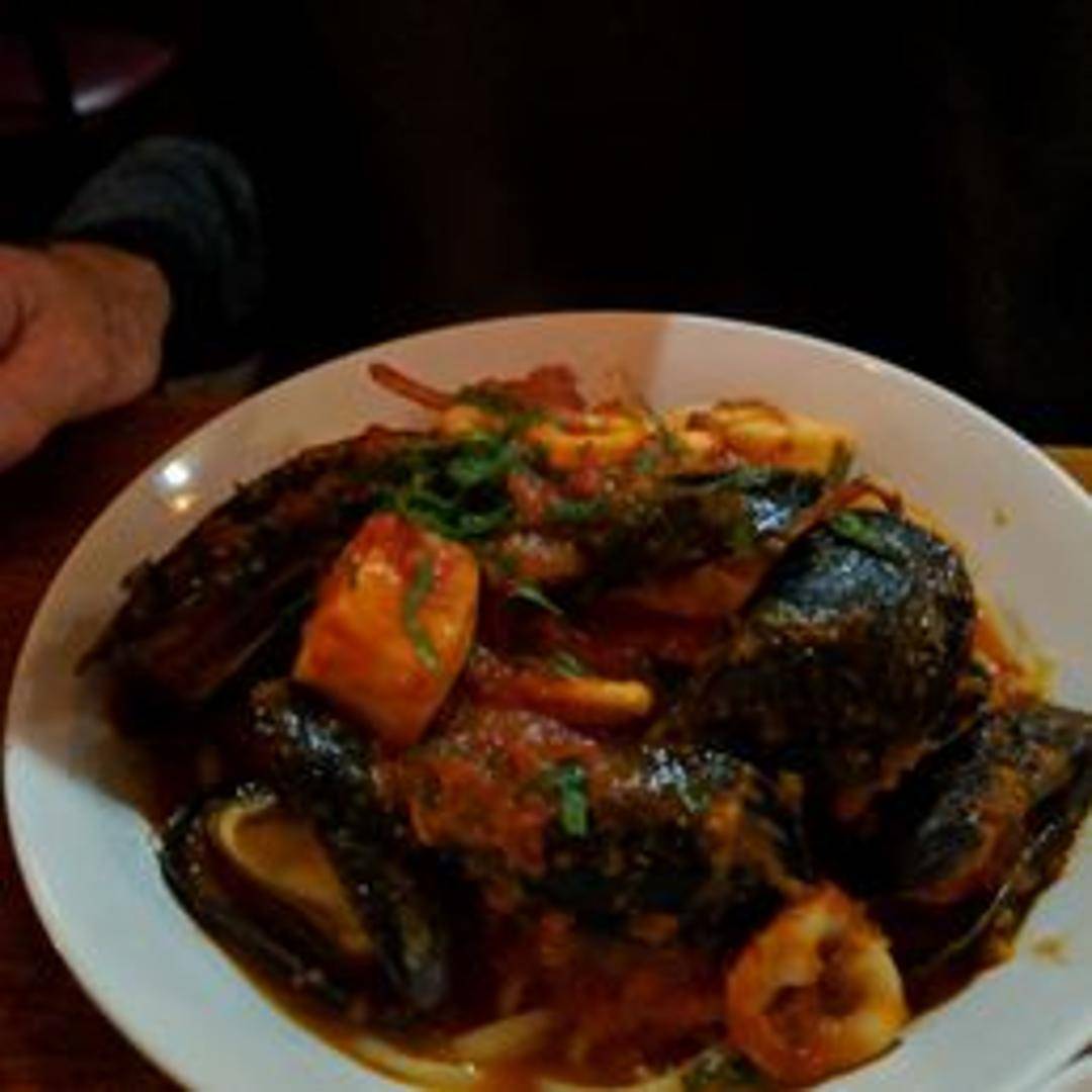 A medley of fresh seafood, including shrimp, mussels, clams, and calamari, tossed with pasta in a light garlic and white wine sauce. Garnished with fresh parsley and a sprinkle of red pepper flakes. A flavorful and satisfying dish for seafood lovers.