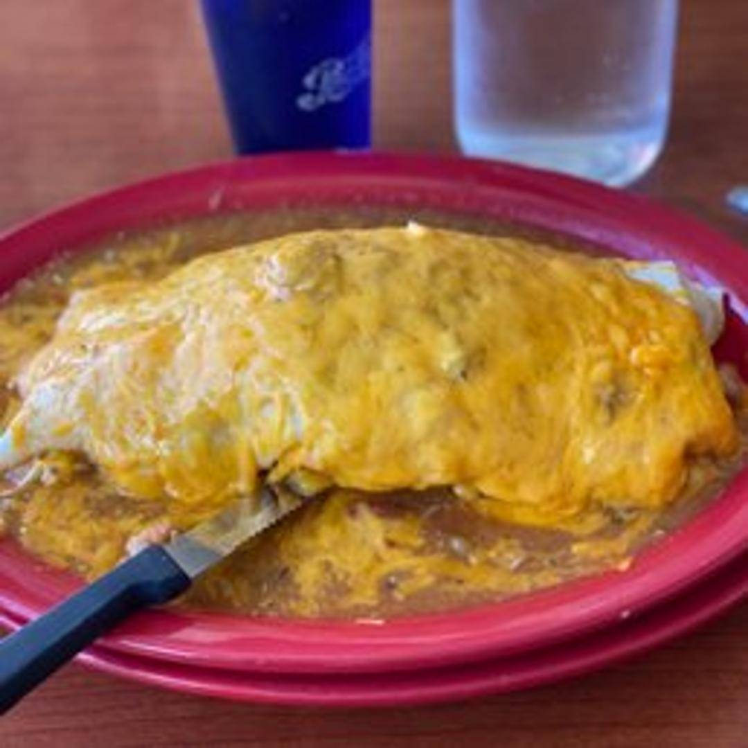 A large burrito filled with a variety of ingredients, typically including meat (such as ground beef, pork, or chicken), beans, rice, cheese, lettuce, tomato, onion, and your choice of chili. A massive and satisfying meal.