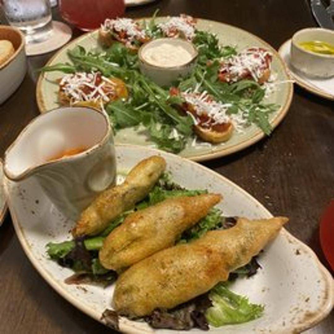A classic Italian antipasto, featuring slices of rustic bread grilled to perfection, then rubbed with fresh garlic and drizzled generously with extra virgin olive oil. It is traditionally topped with a vibrant mixture of ripe, diced tomatoes, fresh basil, and a sprinkle of sea salt, creating a delightful harmony of fresh and toasted flavors.