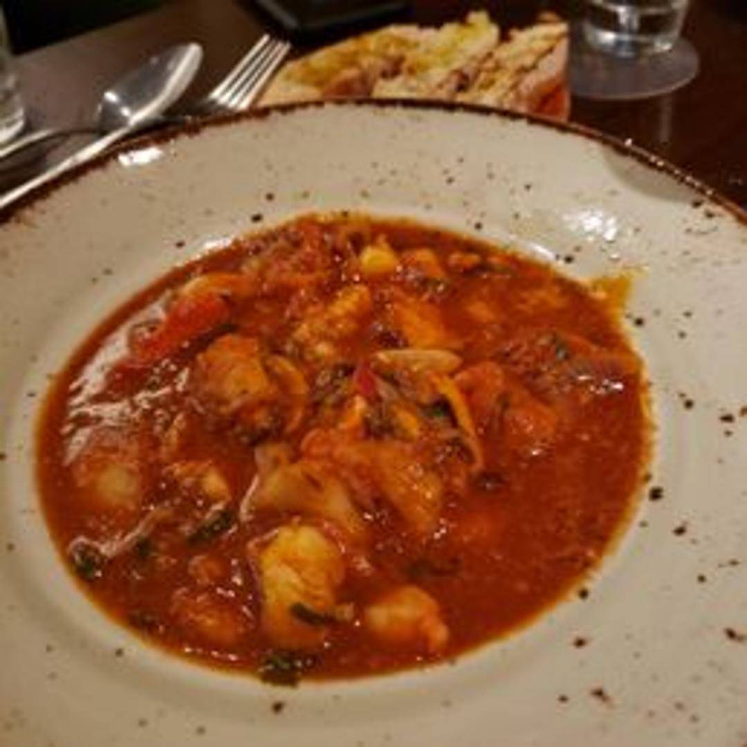 A robust and aromatic Tuscan seafood stew, showcasing a vibrant medley of fresh fish and shellfish, including mussels, clams, and various white fish. Simmered in a rich, flavorful tomato-based broth with garlic, chili, and fragrant herbs, it is traditionally served with crusty toasted bread for dipping.