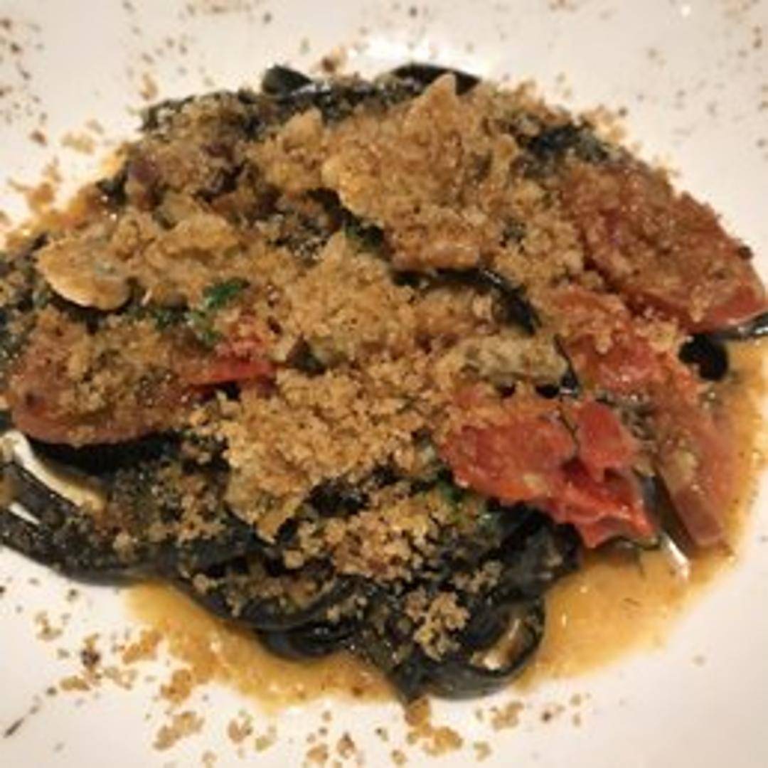 House-made fettuccine pasta, artfully infused with the delicate essence of squid ink, creating a striking ebony hue. This fresh, al dente pasta provides a subtle briny undertone, perfectly complementing a variety of seafood or light, savory sauces.