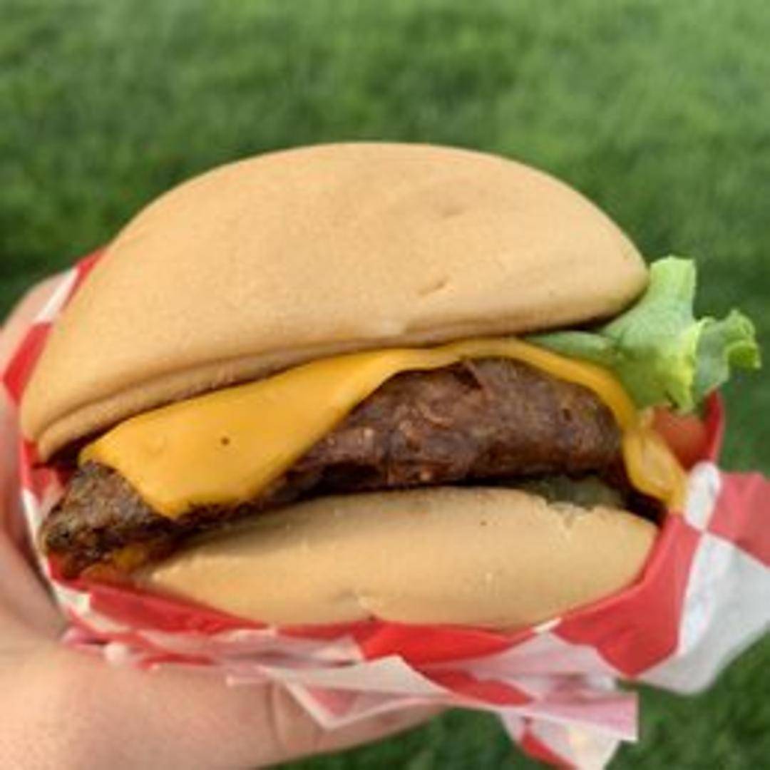 A juicy plant-based burger patty on a toasted bun with lettuce, tomato, onion, pickles, and special sauce.