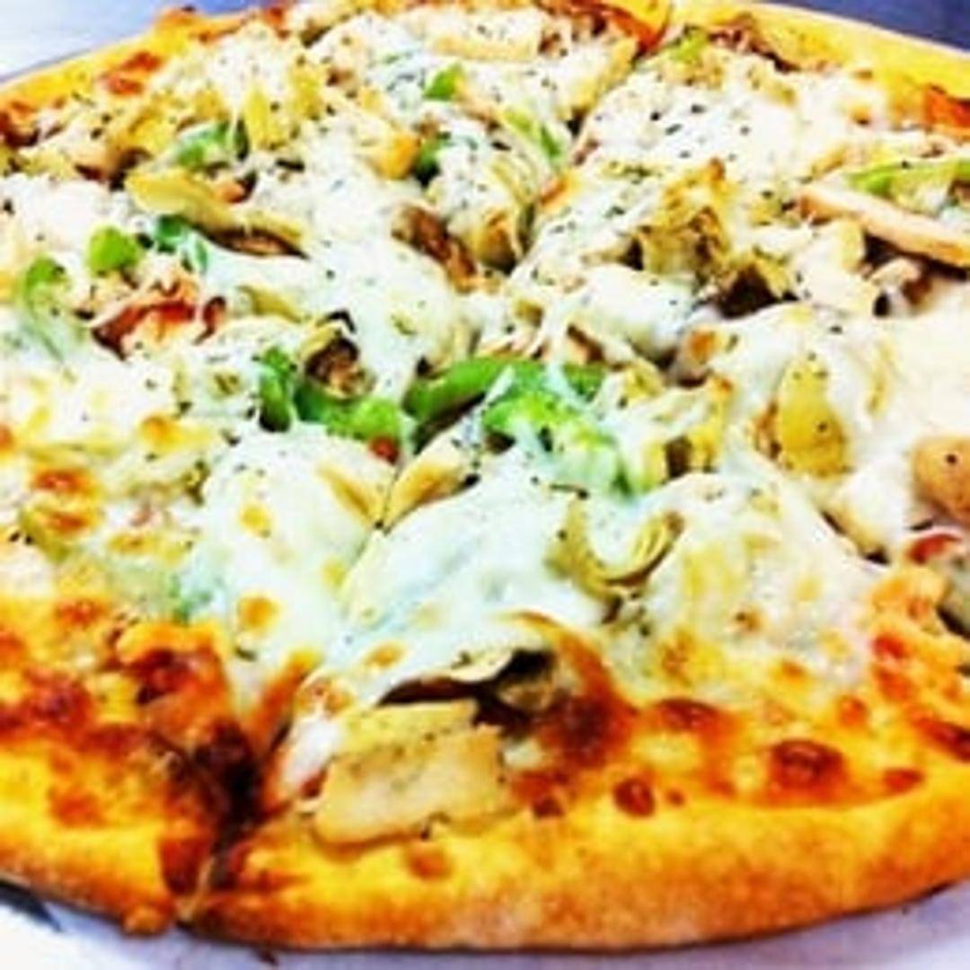 A delicious pizza featuring a garlic-infused crust, topped with tender grilled chicken, savory mushrooms, mozzarella cheese, and a blend of Italian herbs.