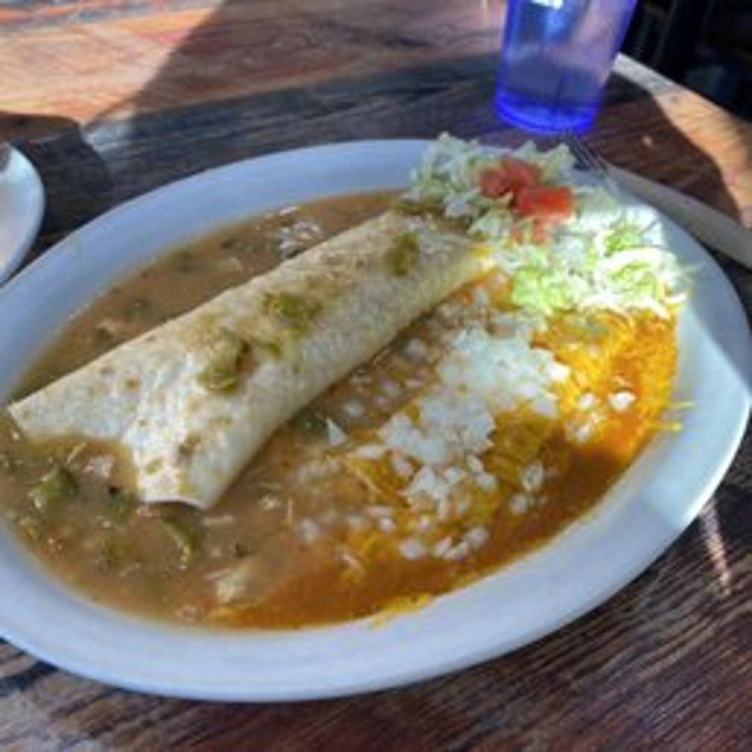 Two corn tortillas filled with melted cheddar cheese and smothered in Santiago's famous green chili. A simple yet satisfying dish, offering the perfect balance of creamy cheese and flavorful chili. Choose your desired spice level: mild, medium, hot, or extra hot.