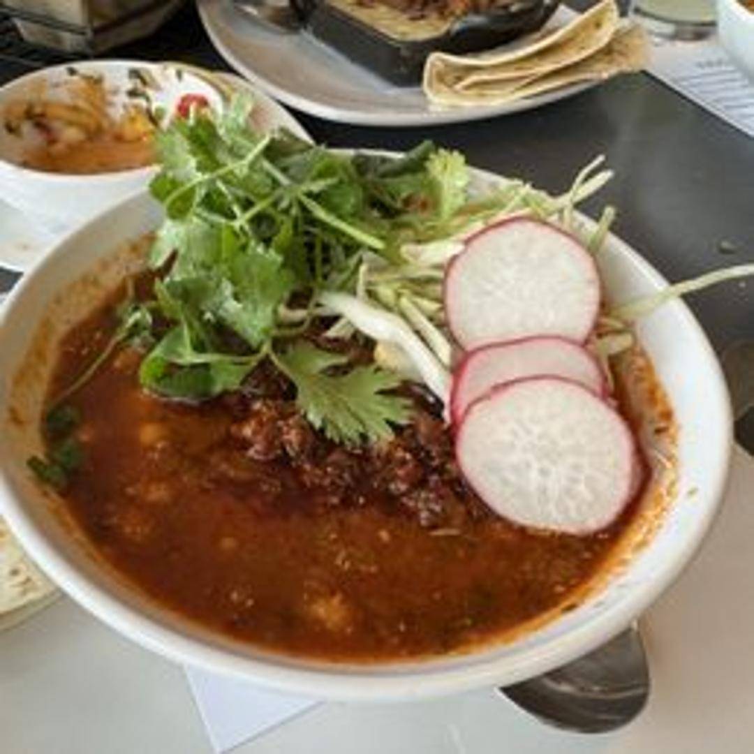 A traditional stew made with hominy, pork, and red chile, often garnished with cabbage, onions, and lime.