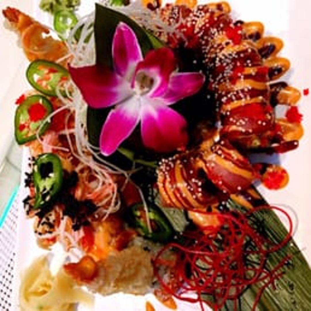 Shrimp tempura and cucumber inside, topped with thinly sliced tuna and avocado. Drizzled with eel sauce and spicy mayo, and finished with tempura flakes.