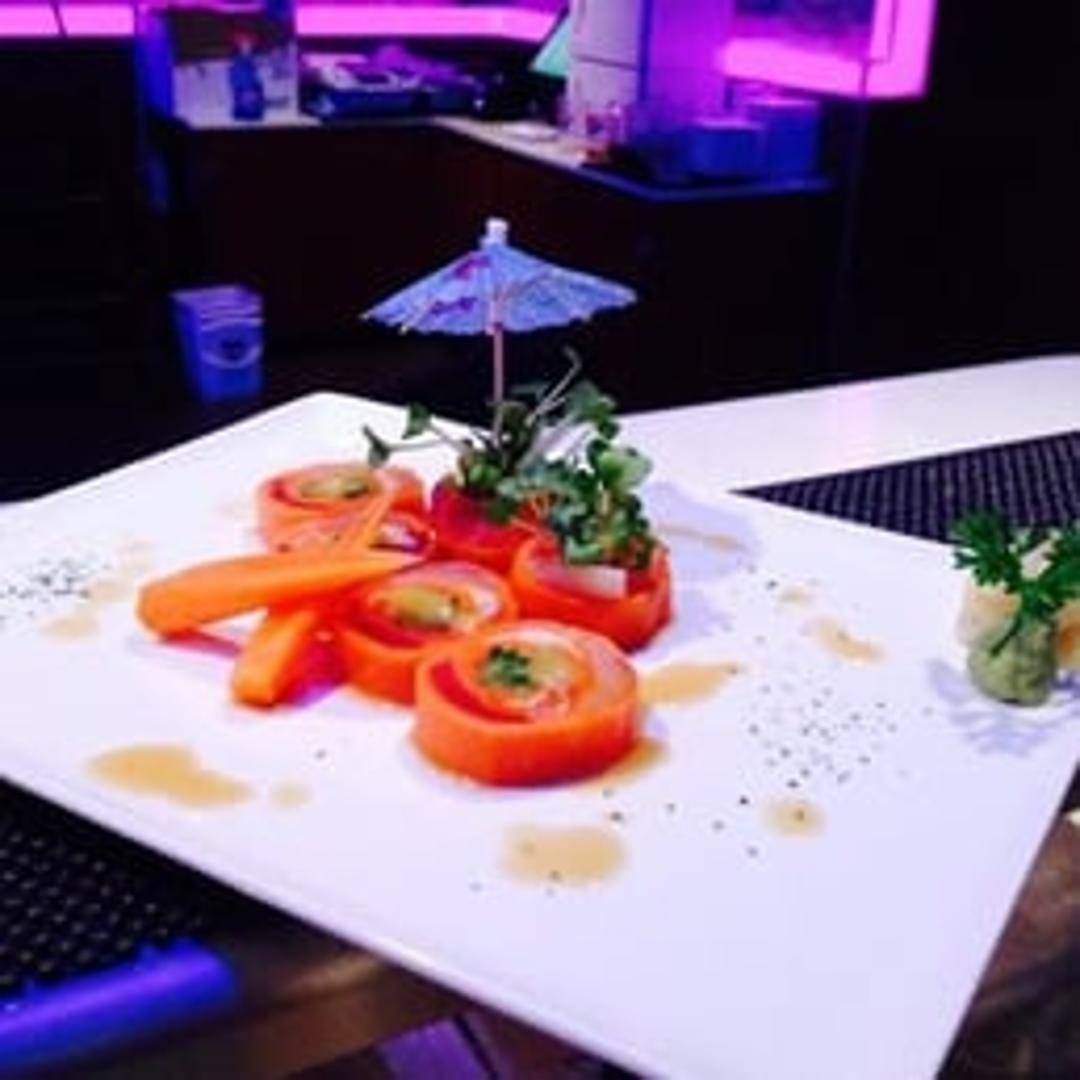 A signature sushi roll featuring tuna, avocado, and cucumber, topped with spicy mayo and eel sauce.