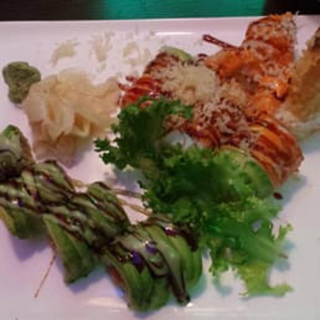 A sushi roll typically featuring shrimp tempura, cream cheese, and avocado, often topped with spicy mayo and eel sauce.