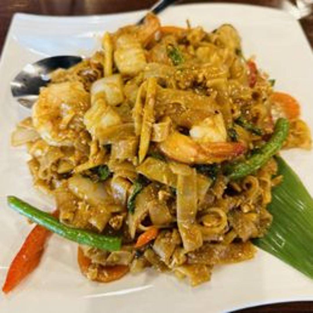 Wide rice noodles stir-fried with your choice of protein (chicken, beef, pork, tofu, or shrimp), basil leaves, bell peppers, onions, tomatoes, and a spicy chili garlic sauce.